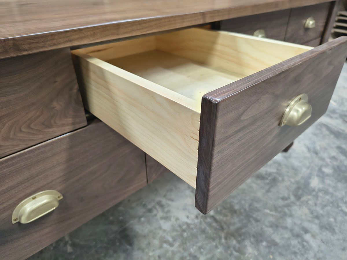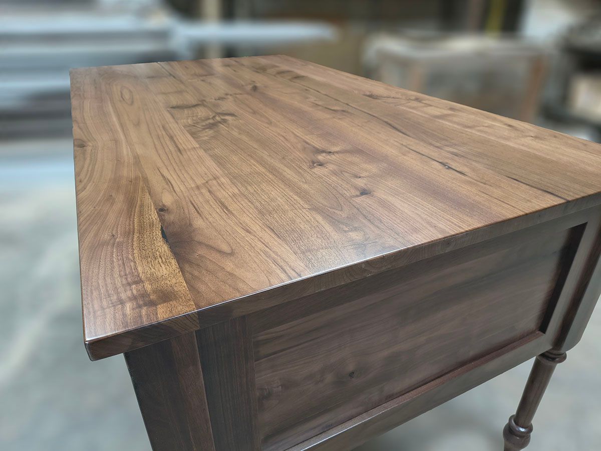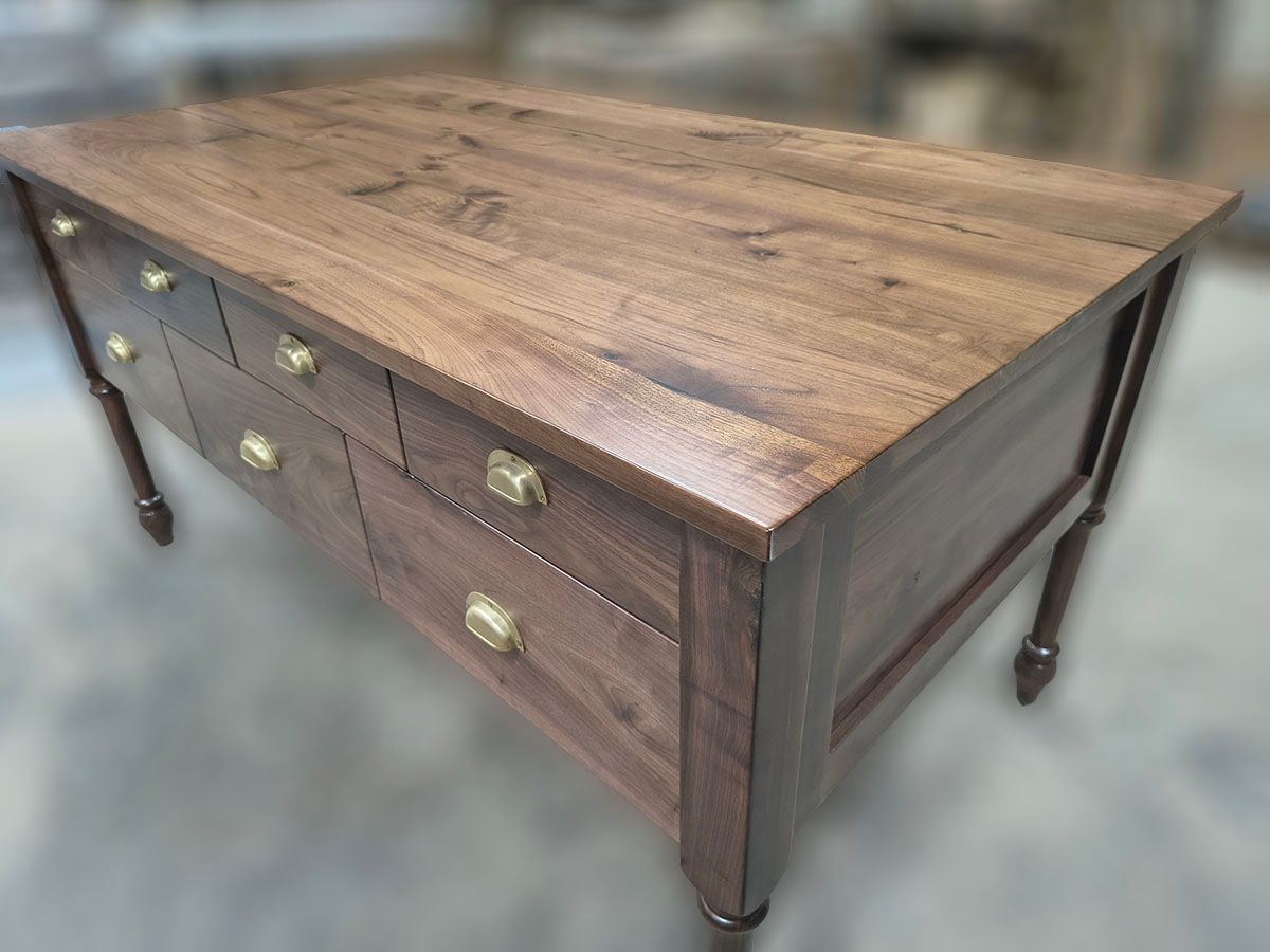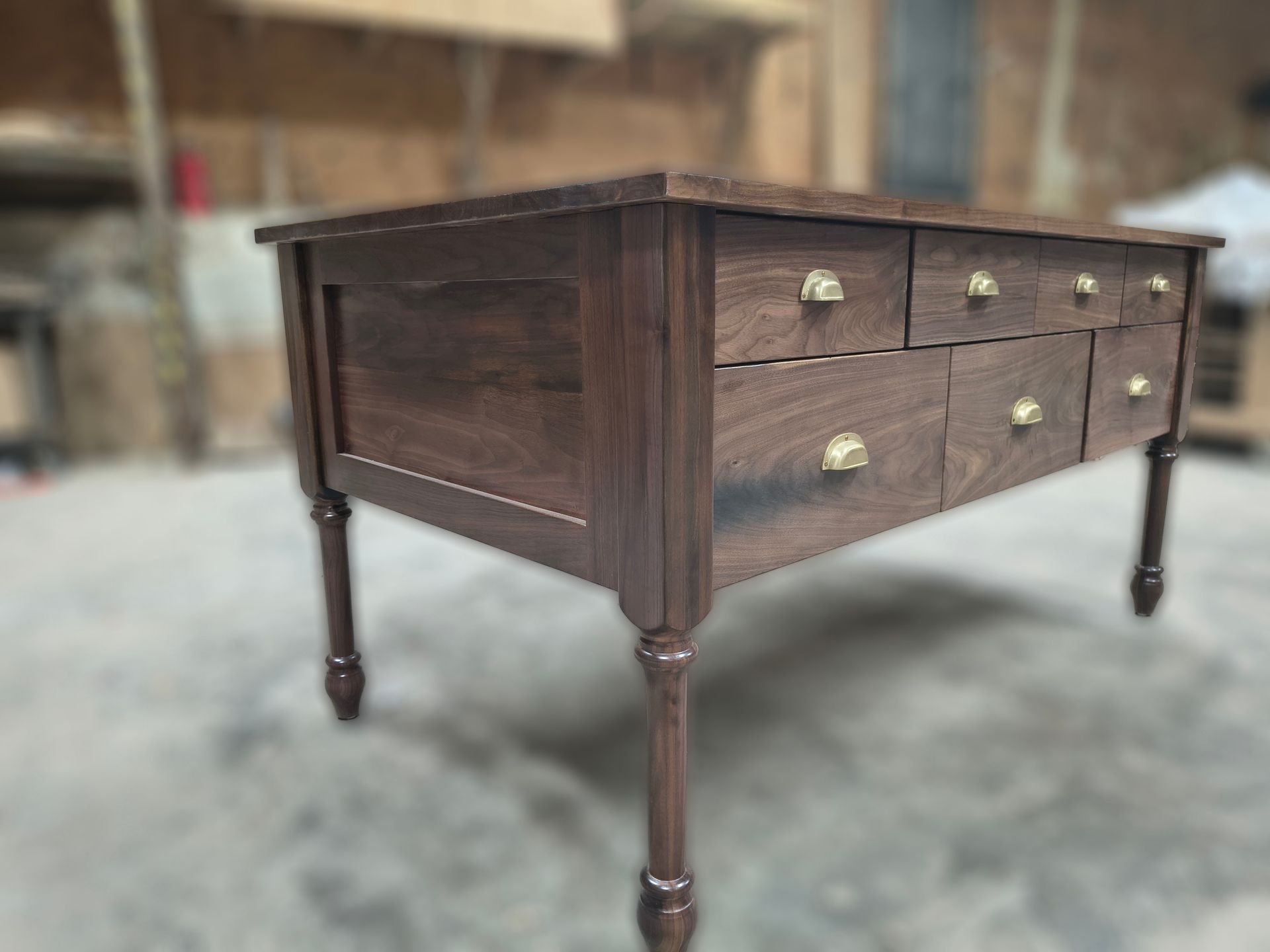 This solid walnut kitchen island combines elegance and practicality to accommodate food prep, serving and dining. The smooth gliding, soft close, drawers offer ample storage on one side and there is ample seating on the other side, making this a perfect workstation for meal prep, homework, socializing and dining.